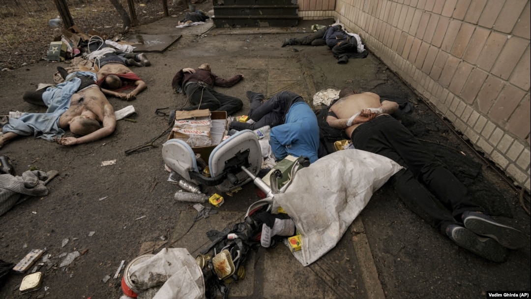 Тела убитых мужчин возле одного из зданий в Буче, у некоторых из них связаны руки. 3 апреля 2022 года. Фото: AP